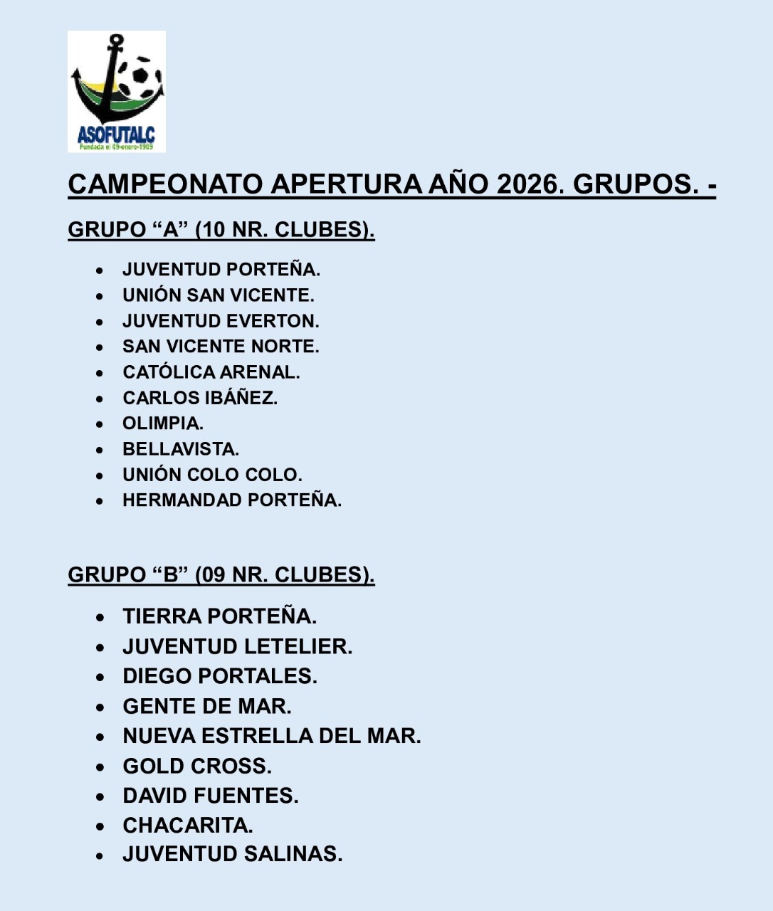CAMPEONATO APERTURA AÑO 2026. GRUPOS.