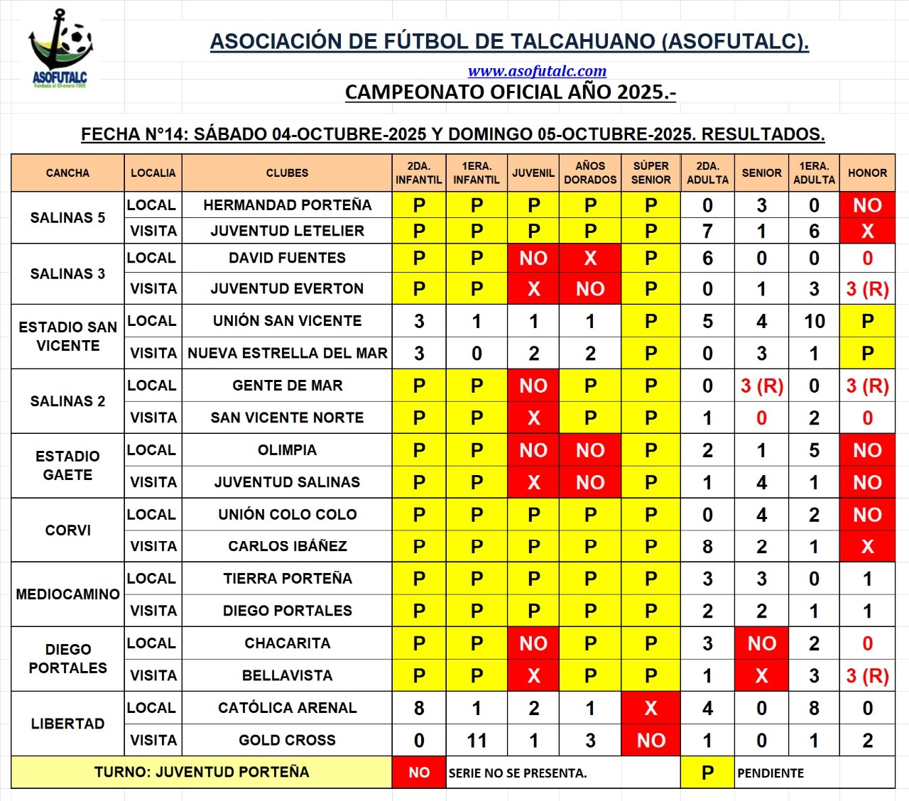 Resultados de la Fecha N°14: Sábado 04 y Domingo 05-octubre-25.