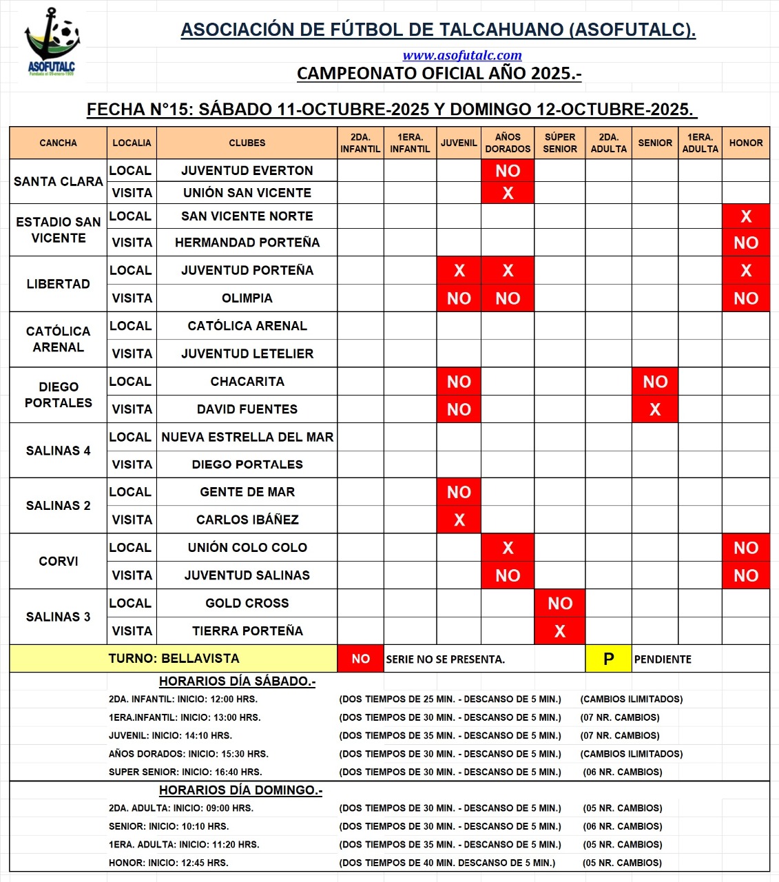 Programación de la Fecha N°15: Sábado 11 y Domingo 12-octubre-25.