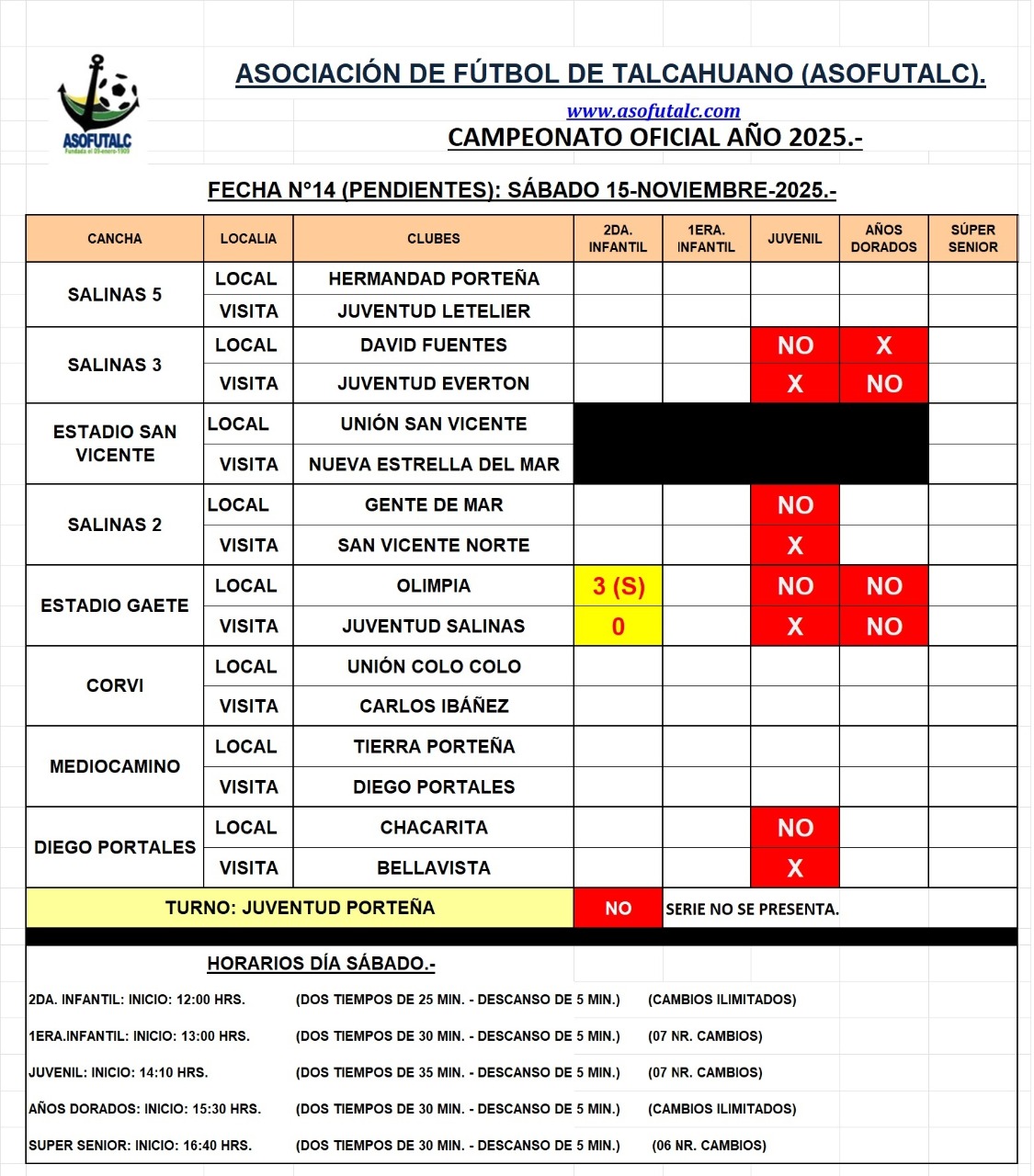Programación de la Fecha N°14 (Pendientes), sábado 15-11-2025.
