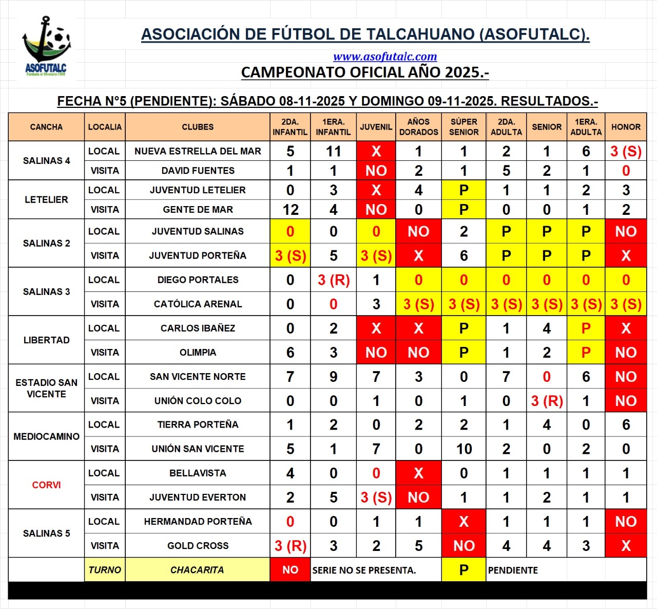 Resultados de la Fecha N°5 (Pendientes): Sábado 08 y Domingo 09-noviembre-25.