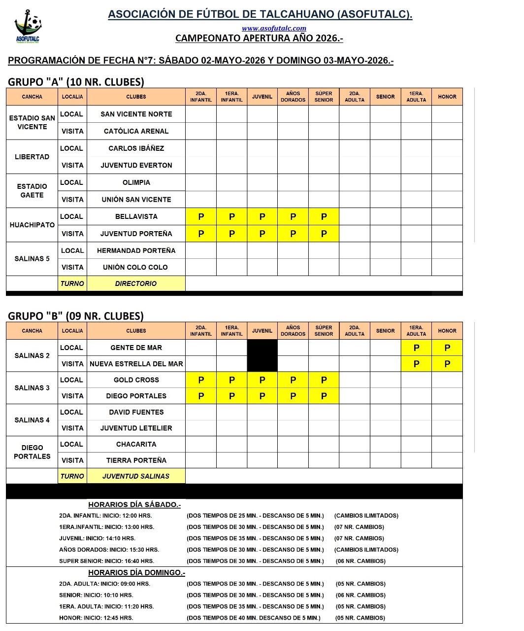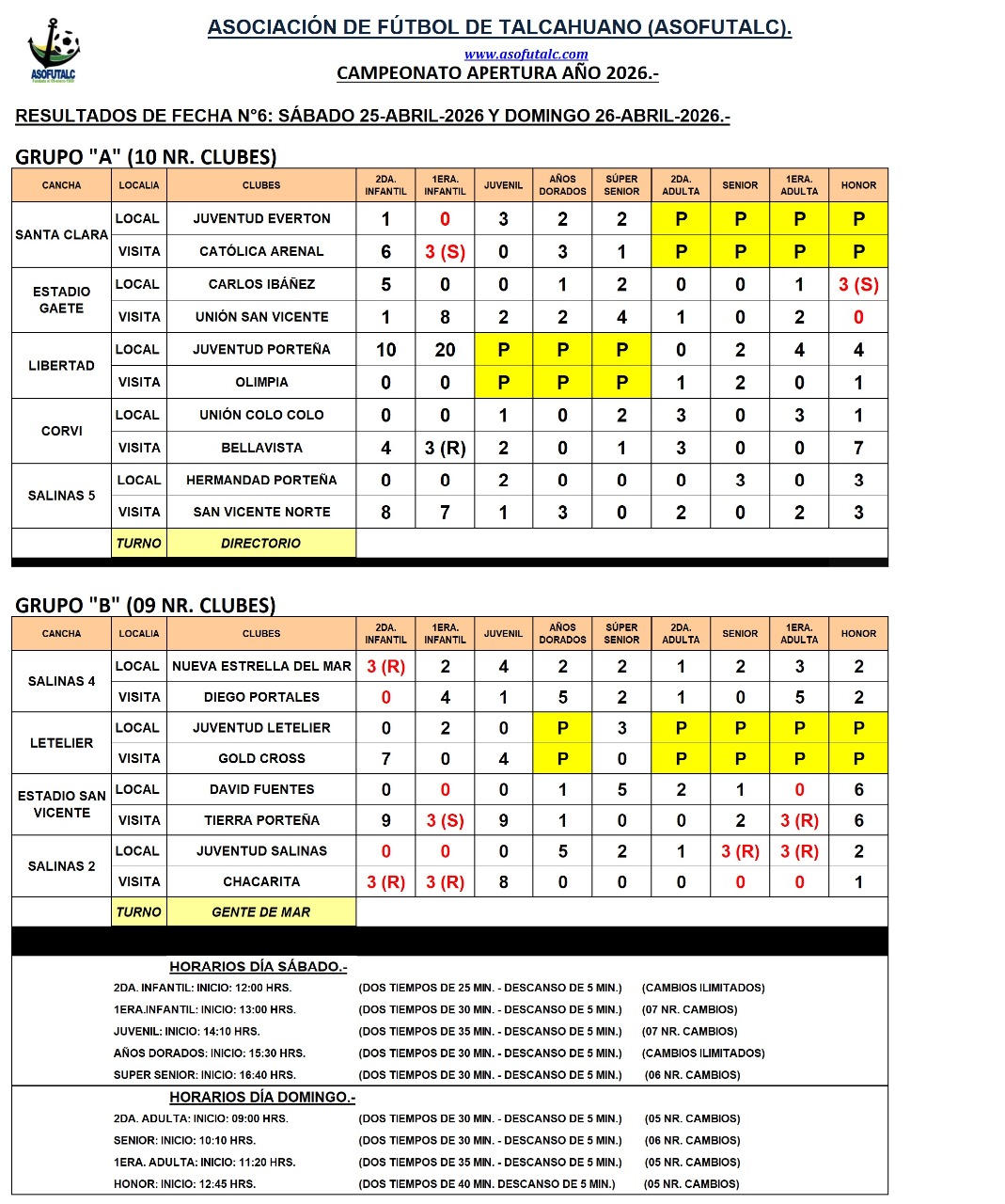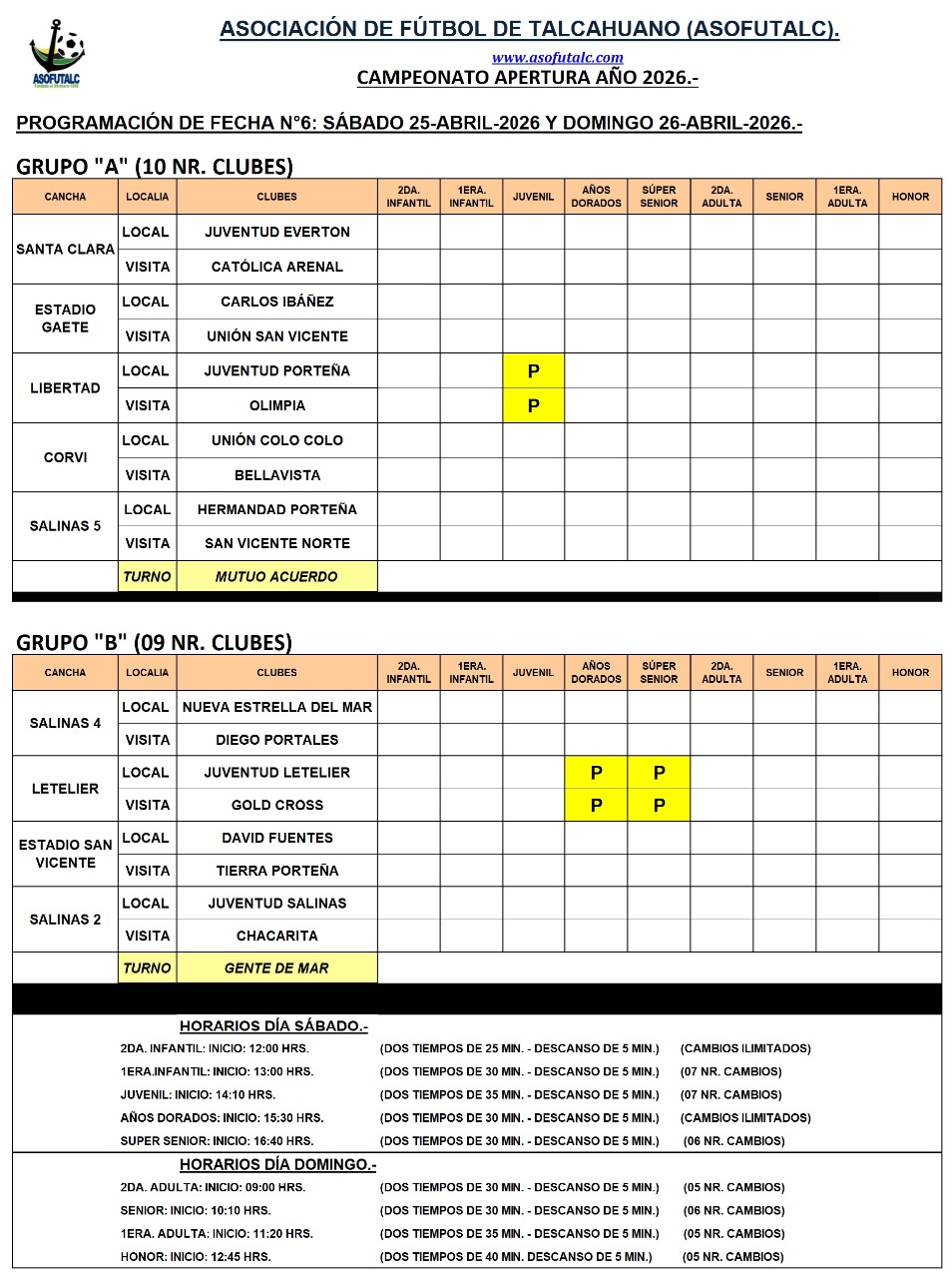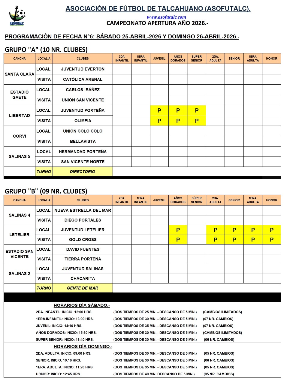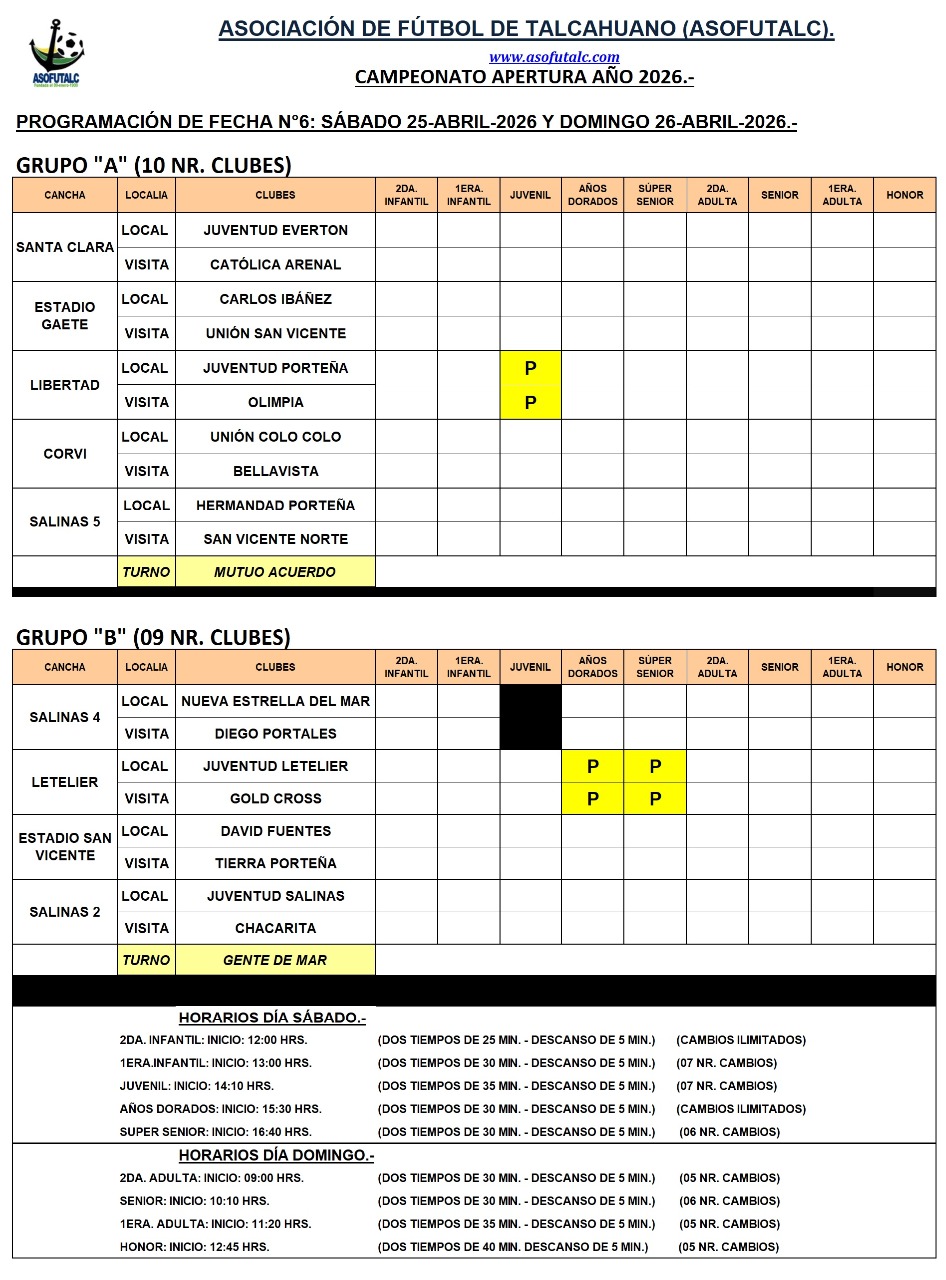 PROGRAMACIÓN FECHA N°6: SÁBADO 25 Y DOMINGO 26-ABRIL-2026.