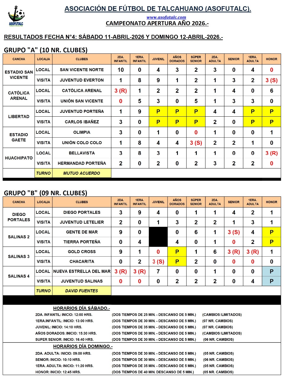 RESULTADOS DE LA FECHA N°4; 11-04-2026 Y 12-04-2026.