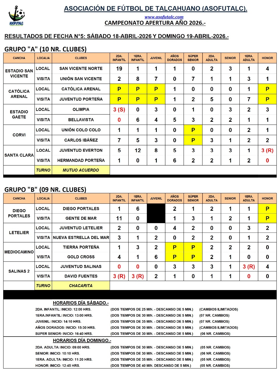 PROGRAMACIÓN FECHA N°5: SÁBADO 18 Y DOMINGO 19-ABRIL-2026.