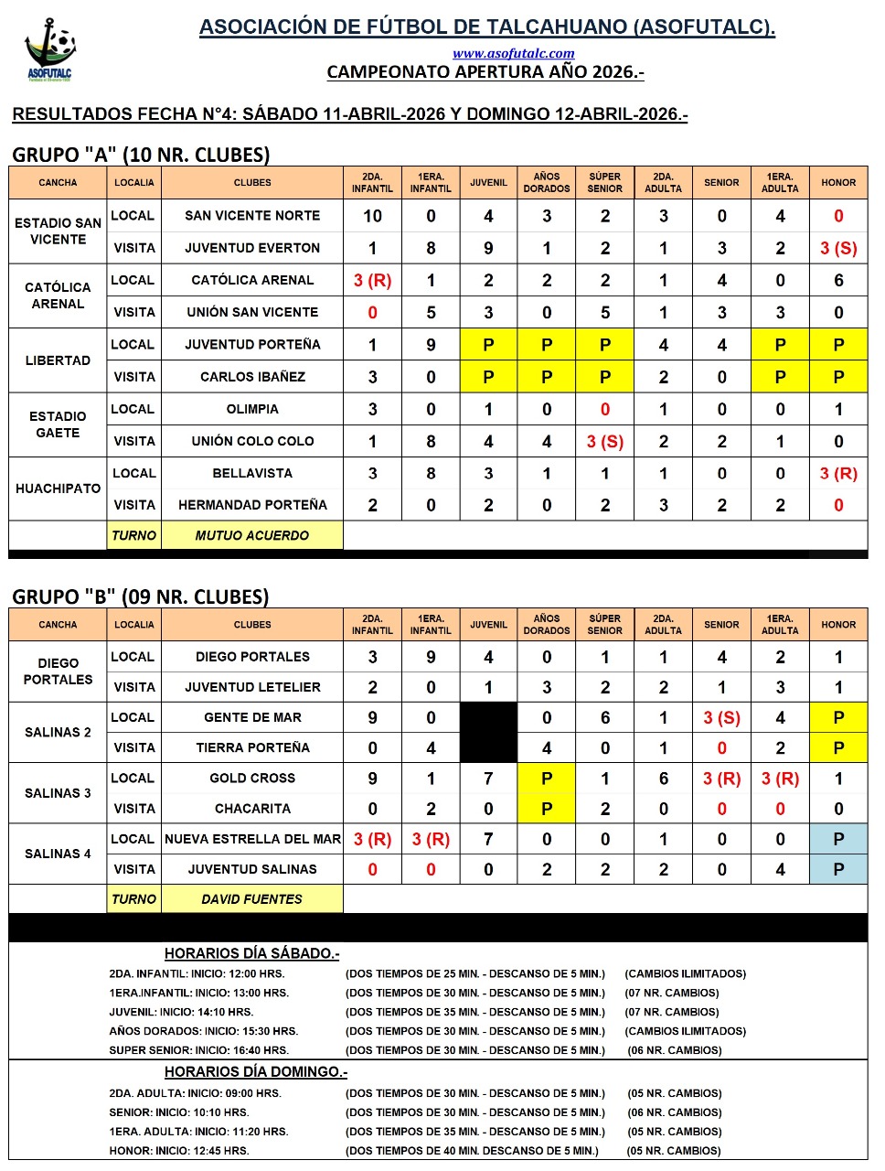 RESULTADOS DE LA FECHA N°4; SÁBADO 11 Y DOMINGO 12-04-2026.