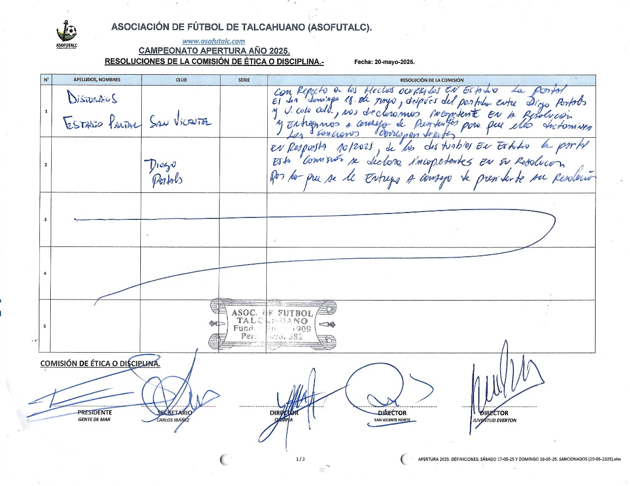 1) FECHA N°1; SÁBADO 05-ABRIL Y DOMINGO 06-ABRIL-25. SANCIONADOS.