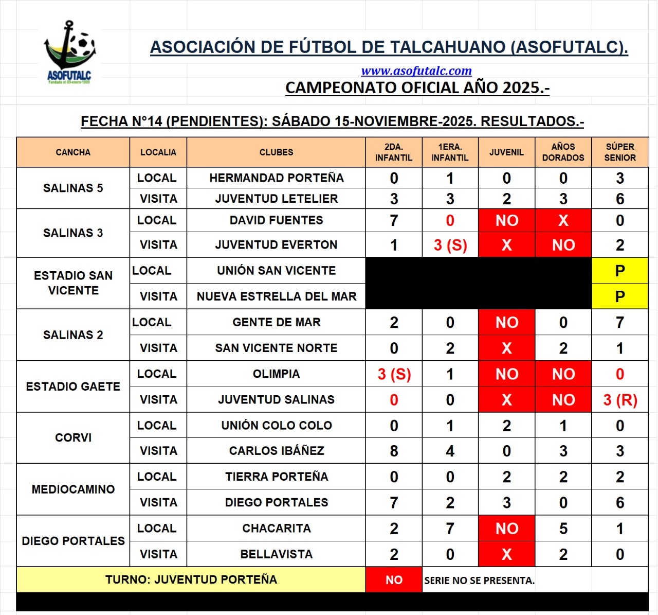18) Fecha N°14: sábado 15-noviembre-25. Resultados.