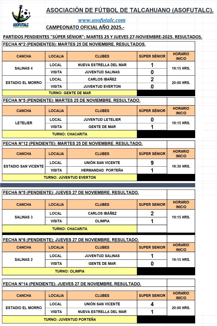 21) Partidos Pendientes Súper Sénior: martes 25-noviembre-25 y jueves 27-noviembre-25. Resultados.