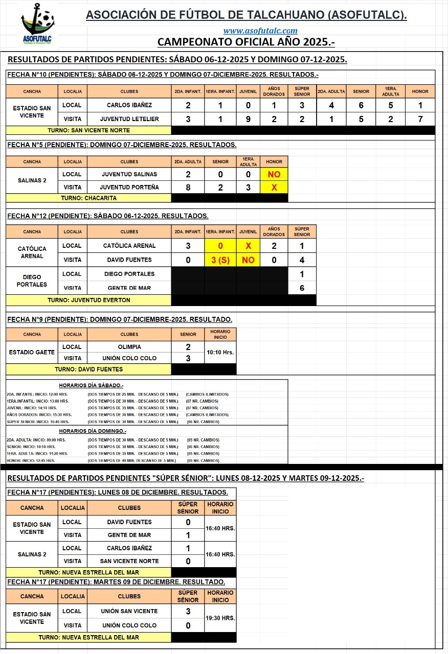 23) Partidos Pendientes: sábado 06-12-25; domingo 07-12-25; lunes 08-12-25 y martes 09-12-25. Resultados.