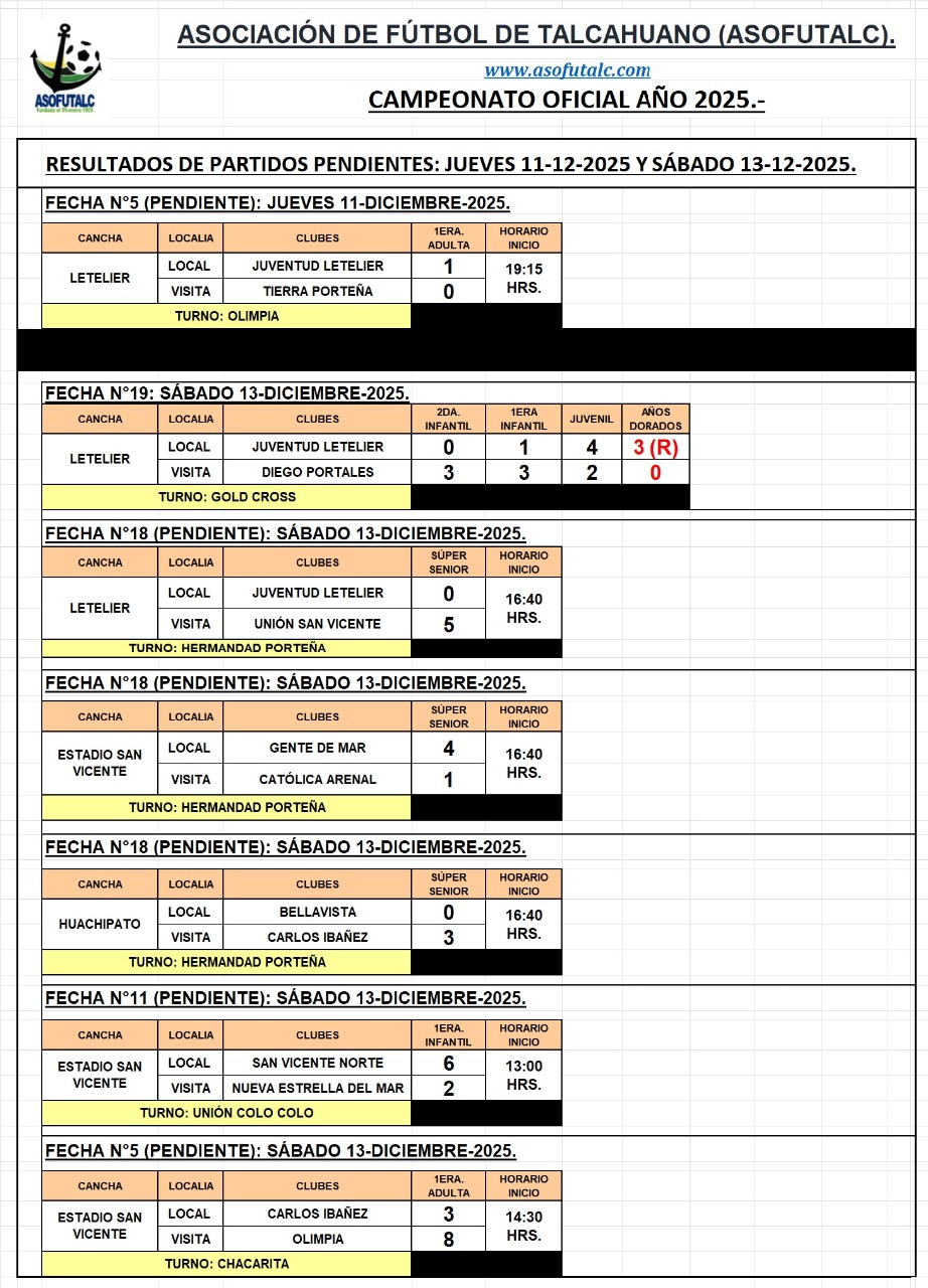 24) Partidos Pendientes: jueves 11-12-25 y sábado13-12-25. Resultados.