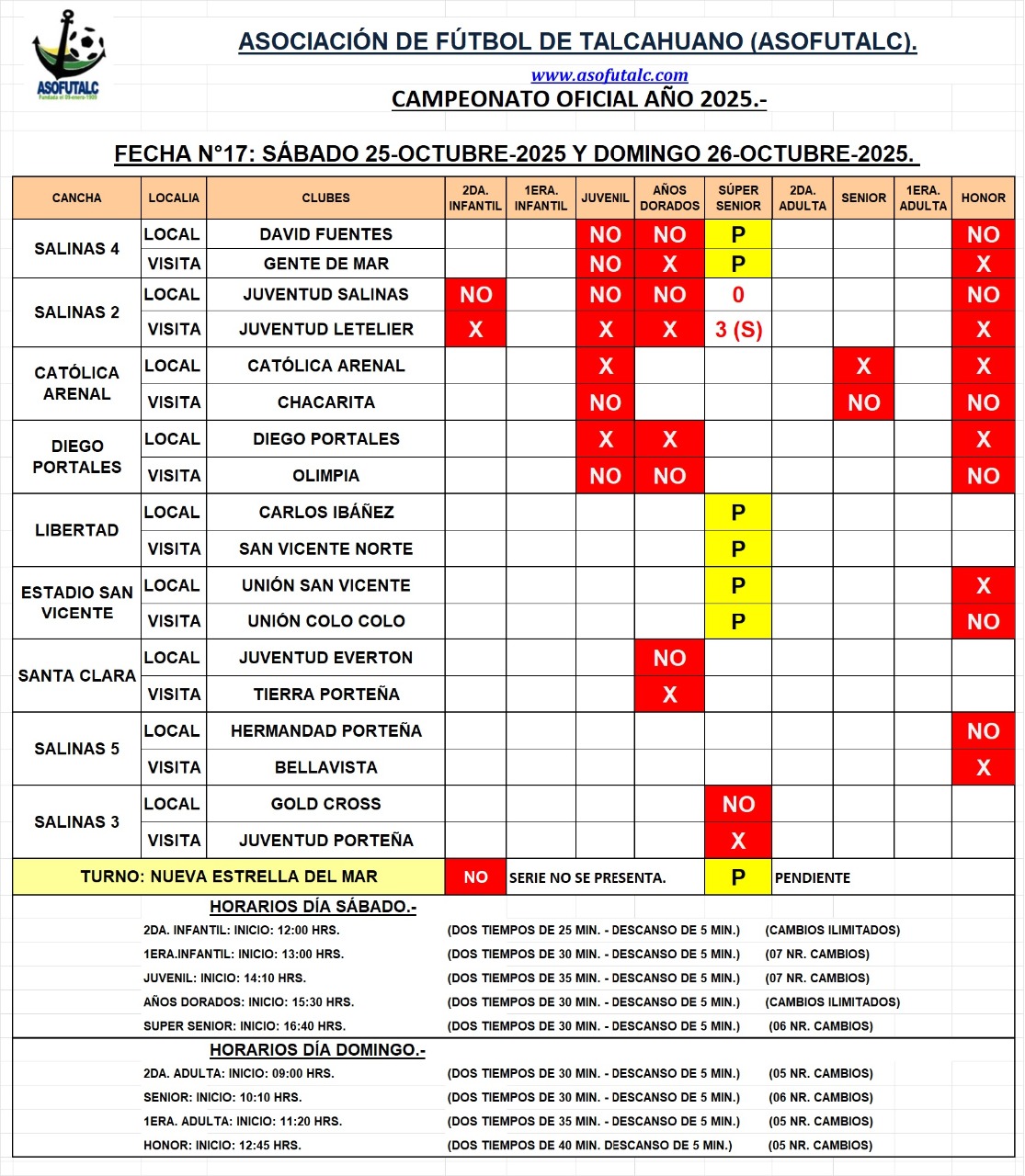 Programación de la Fecha N°17: Sábado 25 y Domingo 26-octubre-25.