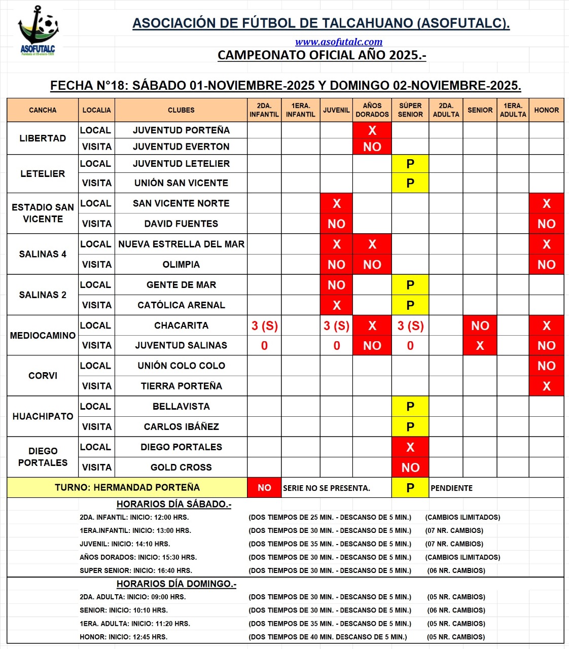 Programación de la Fecha N°18: Sábado 01 y Domingo 02-noviembre-25.