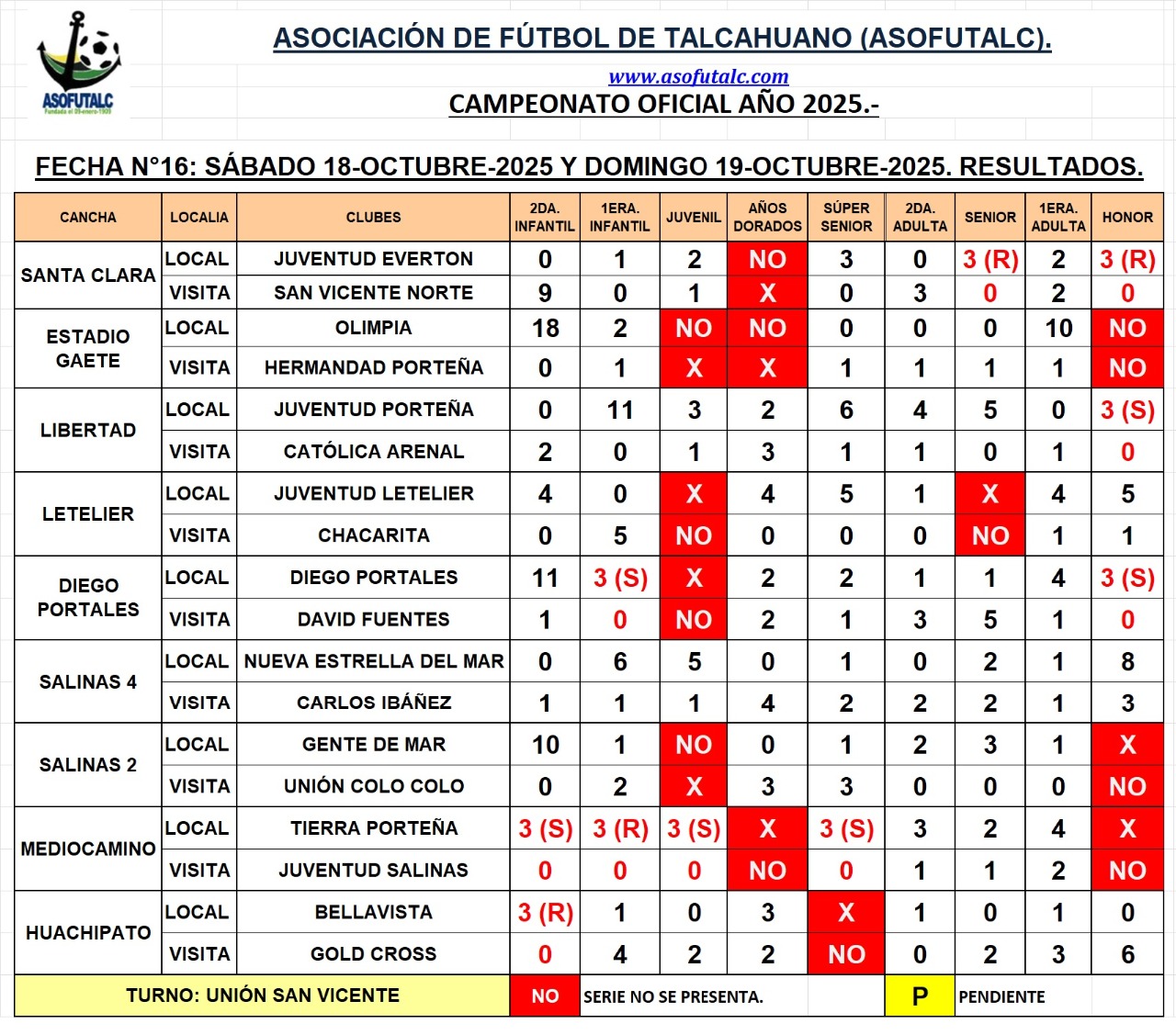 Resultados de la Fecha N°16: Sábado 18 y Domingo 19-octubre-25.