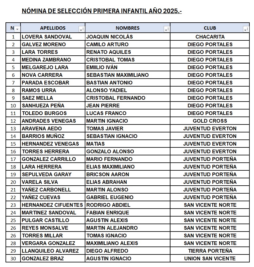 Selección Primera Infantil año 2025 (Menores nacidos año 2010 y 2011).